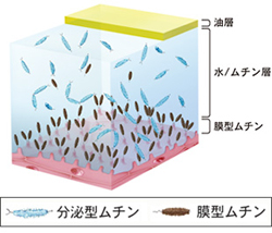涙の層は、厚さ7μm(=0.007㎜)ほどの本当に薄い膜ですが、下から順に、 水/ムチン層、油層に分かれています。目の表面の細胞(結膜上皮細胞と角膜上皮細胞)につながっている膜型ムチンは、本来水をはじく性質をもつ目の表面を親水性にします。これにより、水/ムチン層が、目の表面をなめらかに覆うことができると考えられます。表層の油層は、涙の蒸発を防ぎます。